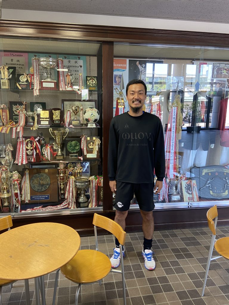2021シーズンにはJFLの鈴鹿ポイントゲッターズに所属しておりましたが、その後退団し現在はチームに所属しておりません。しかし、今後もサッカー選手として活動する意思を持っており、当日はケガのリハビリを兼ね現役チーム練習に参加するため来校して頂きました。